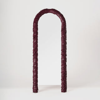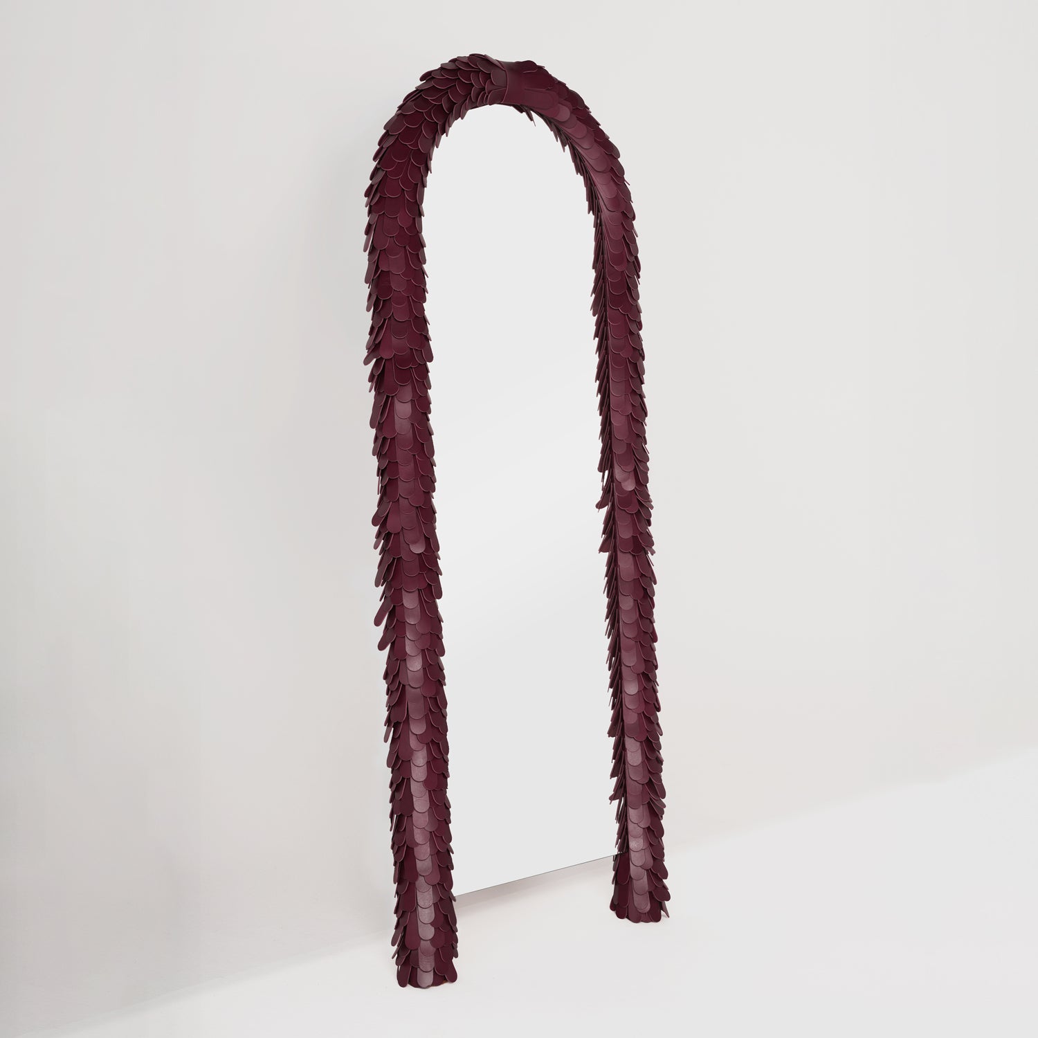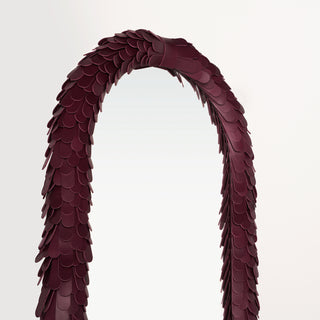 The Betsy Mirror designed by Lara Bohinc for Uniqka balances traditional craftsmanship with contemporary aesthetics. The bold sculptural and voluminous forms combine intricate leatherwork to create a harmonious fusion of texture and structure offering a refined yet playful presence. Each piece is meticulously handcrafted using vegetable-tanned saddlery leather which is individually cut treated and layered onto wooden frames to create a striking three-dimensional feathered effect. The inspiration for the Betsy Collection stems from plumage and how birds’ feathers are layered. Captivated by the way feathers overlap to create a rhythmic textured surface the collection reflects the refinement and organic harmony found in the natural world. This interplay of softness and structure brings a sense of fluidity and personality to each piece.