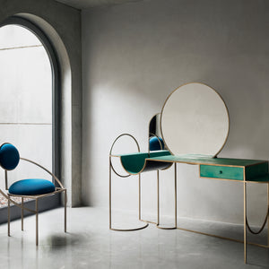 The pieces are manufactured from square steel rods, which are laser-cut and welded to form combinations of semi circles and straight lines. This creates a playful and layered table with the striking verdigris copper table tops that contrast with the structural rods, fabricated in either dark chocolate bronze or a brass coated steel. The Orbit tables are handmade in Italy, combining traditional craft and modern finishing techniques, and are released in limited edition of 10.