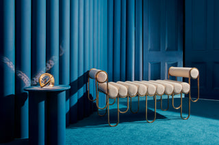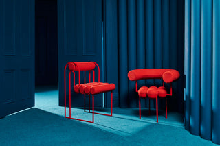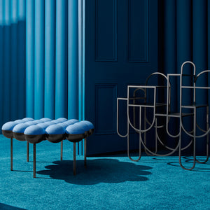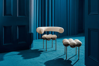 Bohinc explores the combination of delicate lightweight metalwork and plump upholstery with two different seating collections, creating substantial and comfortable forms that seem to float. Expressed with a connected design language, spherical upholstered shapes are set in the subtle lines of the graphic metalwork, the soft cushions elegantly held by the metal structure. Constructed from galvanised steel square rod and wool fabric, the pieces are fresh and ebullient.