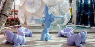 Painted by hand in vibrant pastel hues of pistachio, aqua, lavender, cherry blossom and eggshell blue, Bohinc’s designs pay homage to Miami’s architectural colour palette and bring elements of playfulness, functionality and comfort to the outdoor areas that the installations inhabit. With a focus on environmental issues, Bohinc’s pieces are made from cork – a natural, waterproof and environmentally friendly material, native to Portugal, constructed with the assistance of a 5D robotic milling machine and completed by hand.