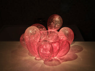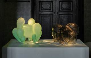 Complementing the seating is a Dark Woods Table, crafted in Portugal from solid mahogany. Its floating, organic surfaces rest on muscular, rock-like formations, shaped through a fusion of 5D laser cutting and hand chiseling, creating a striking balance between refined craftsmanship and raw materiality. The collection’s hand-blown Wild Lands glass sculptures, produced in Bohemia, Czechia, reinforce its dreamlike essence. Rendered in white, pistachio, smoke, and cyclamen hues, these fluid, curvaceous forms appear to grow organically from their bases, shaped by master glassmakers during the International Glass Symposium.
