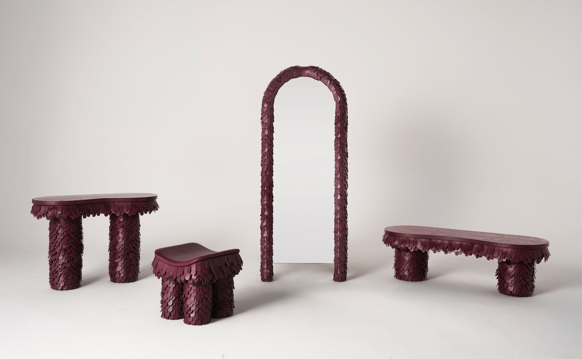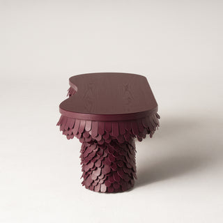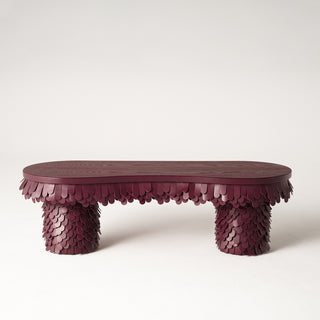 The Betsy Bench designed by Lara Bohinc for Uniqka balances traditional craftsmanship with contemporary aesthetics. The bold sculptural and voluminous forms combine intricate leatherwork to create a harmonious fusion of texture and structure offering a refined yet playful presence. Each piece is meticulously handcrafted using vegetable-tanned saddlery leather which is individually cut treated and layered onto wooden frames to create a striking three-dimensional feathered effect. The inspiration for the Betsy Collection stems from plumage and how birds’ feathers are layered. Captivated by the way feathers overlap to create a rhythmic textured surface the collection reflects the refinement and organic harmony found in the natural world. This interplay of softness and structure brings a sense of fluidity and personality to each piece.